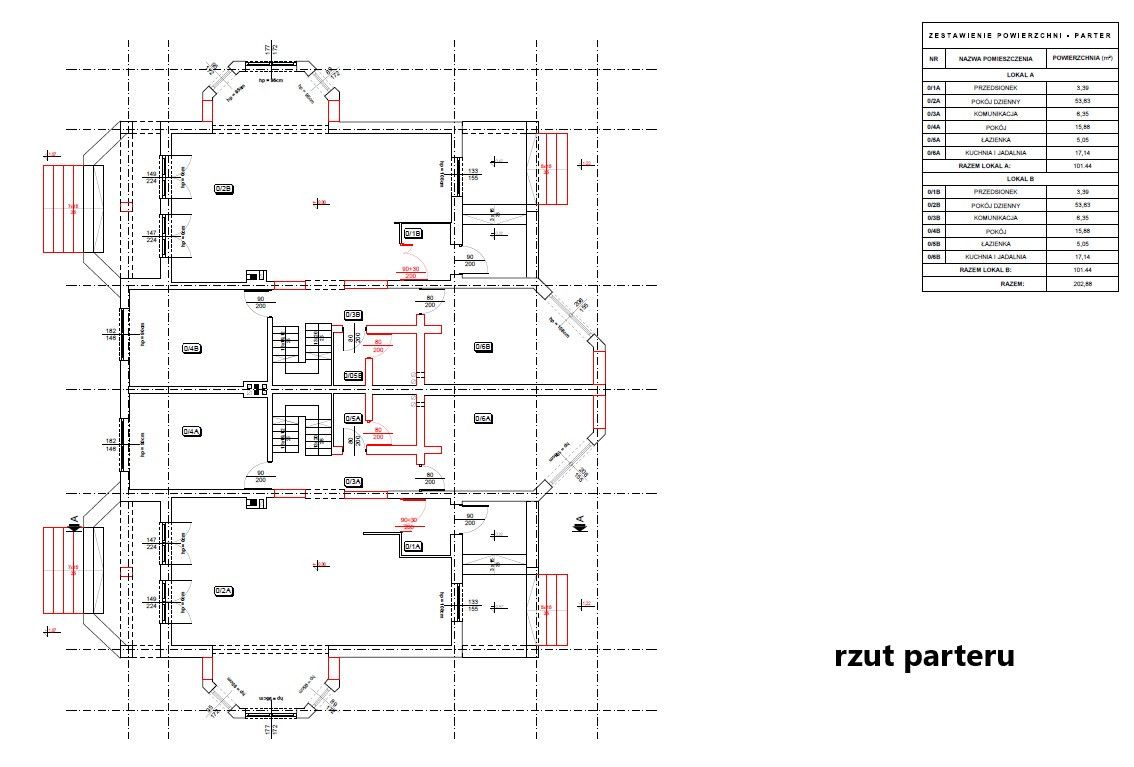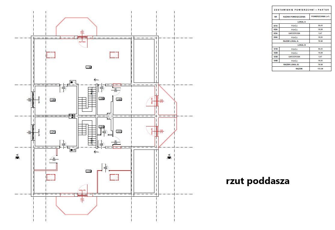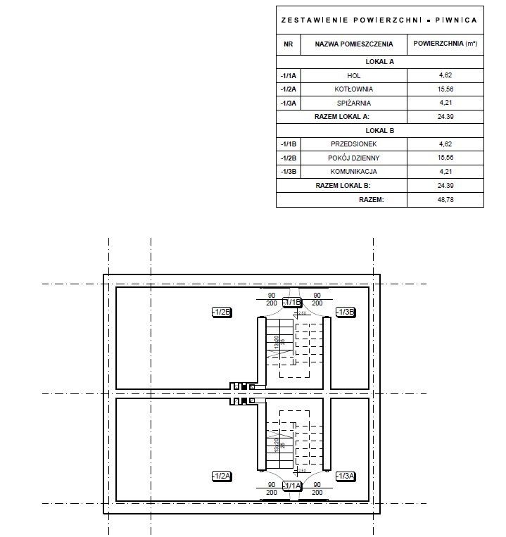 Wnętrza obu domów stanowią odbicie lustrzane. Na parterze znajdziemy sypialnię o powierzchni 15,88m2, kuchnię z jadalnią oraz łazienkę a także imponujący obszerny salon o powierzchni 53,64m2 z wyjściem na taras, który staje się naturalnym przedłużeniem salonu oraz stwarza możliwość relaksu na świeżym powietrzu. Poddasze uwzględnia trzy sypialnie o powierzchniach 39,43m2, 16,08m2 i 16m2- jeden z nich można wykorzystać np. na zaaranżowanie biura. Dodatkowo na piętrze znajduje się garderoba, co ułatwi utrzymanie porządku i ładu. Mieszkańcy obu nieruchomości mają do swojej dyspozycji piwnicę o powierzchni 24,39m2, z wydzielonym miejscem na kotłownię i spiżarnię- całość tworzy kompleksową przestrzeń podziemną, która nie tylko służy praktycznym celom, ale także wprowadza element organizacyjny do codziennego funkcjonowania domu.