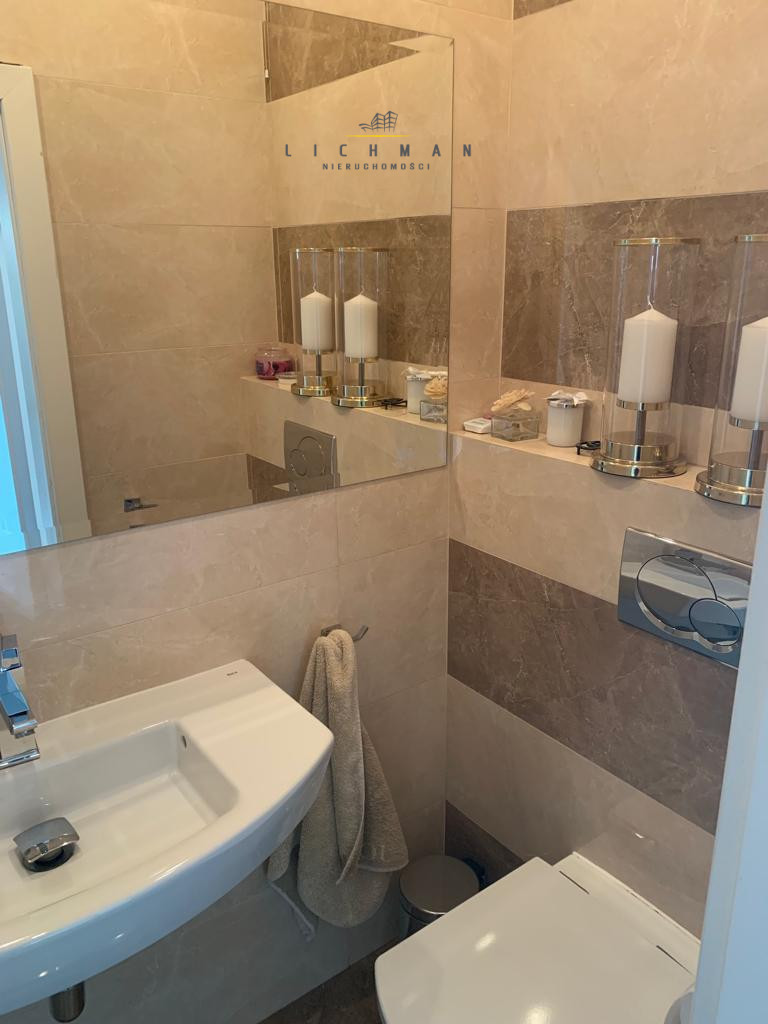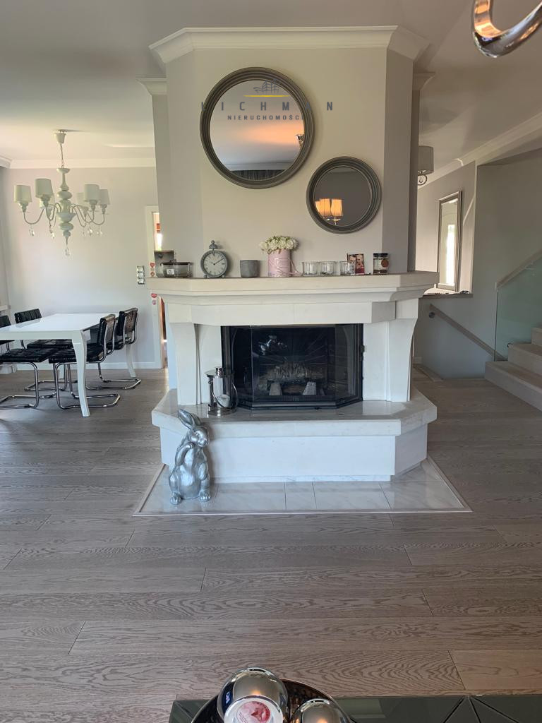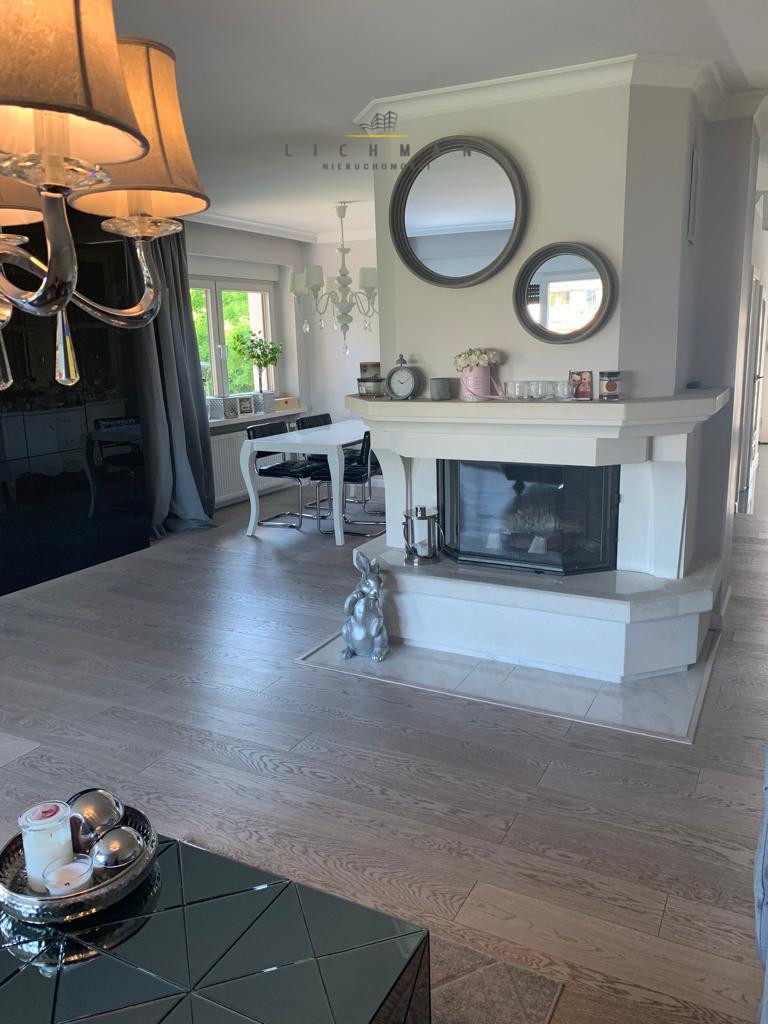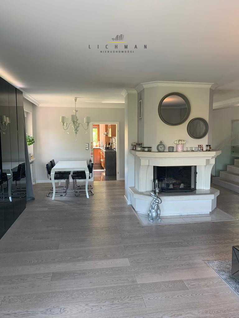 Kuchnia, jadalnia, toaleta, garderoba, przestronny salon z kominkiem i wyjściem na 41-metrowy taras.